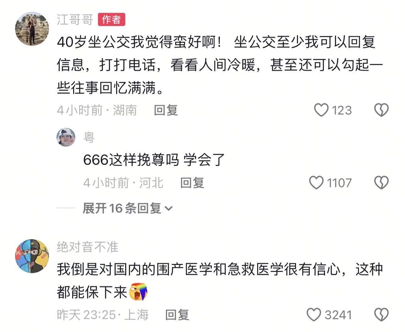 此言一出,评论区立刻热闹起来。不少网友纷纷调侃这位网友的无知,认为他对公交车的设计和汽车工业的发展一无所知。面对网友的调侃,这位网友也幽默地回应道:“40岁坐公交我觉得蛮好啊!坐公交至少我可以回复信息,打打电话,看看人间冷暖,甚至还可以勾起一些往事回忆满满。”