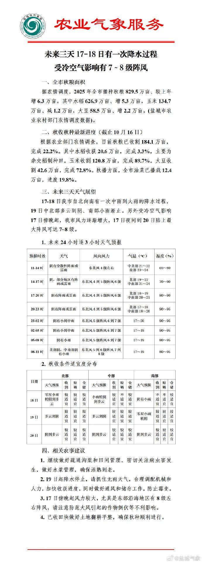 据@盐城气象,目前盐城秋粮收割已完成22.2%。预计17-18日当地将有一次降水过程。