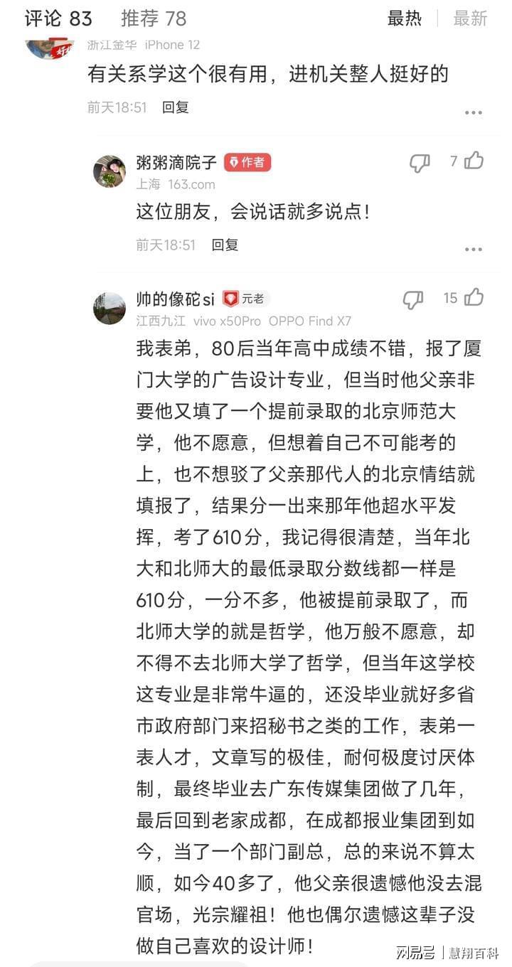 紧接着,江西网友分享了他表弟的案例。这位80后表弟历经波折,最终考上了北师大的哲学专业。毕业后,他引来了很多政府部门的青睐,纷纷招他做秘书。但他没有选择这条路,而是进入了传媒行业,后来还成为了部门副总。