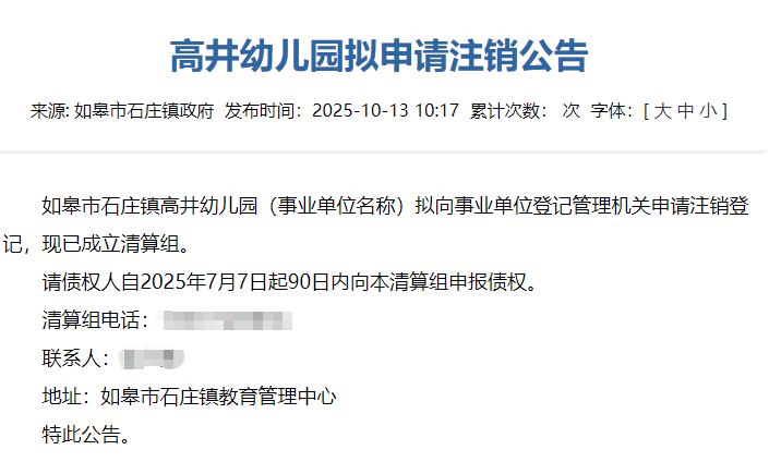 无独有偶,如皋石庄镇高井幼儿园也于近期发布注销公告,成为南通地区又一家停办的学前教育机构。两所幼儿园的相继关停,引发了家长和社会对学前教育资源变化的关注。