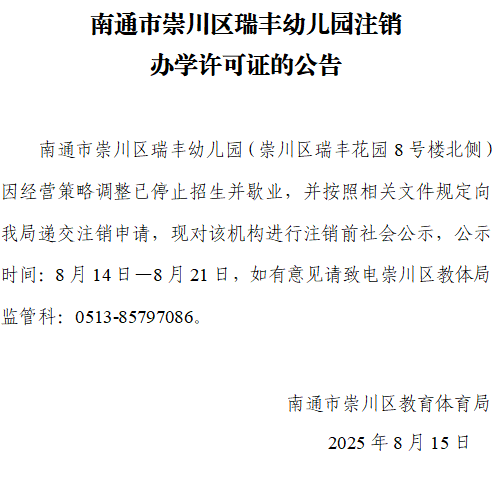同样在8月,南通市崇川区教体局发布公告,宣布南通市崇川区瑞丰幼儿园停止招生并歇业,已递交注销申请。这一决定对崇川区的学前教育布局产生了直接影响,许多家长不得不为孩子寻找新的入园选择。