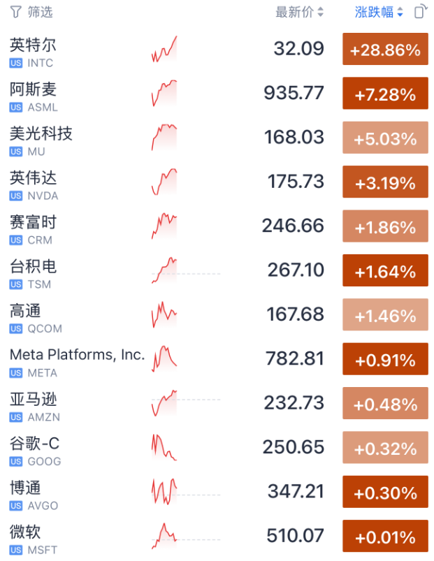 市场最瞩目的交易当属英伟达向英特尔注资50亿美元。这笔战略投资直接推动英特尔股价暴涨28%,创下1984年以来最大单日涨幅。作为回应,英伟达自身股价也上涨3.2%。在降息环境下,科技股整体表现强劲:美光科技涨5%,阿斯麦涨7%,高通、AMD等芯片巨头均涨超4%。