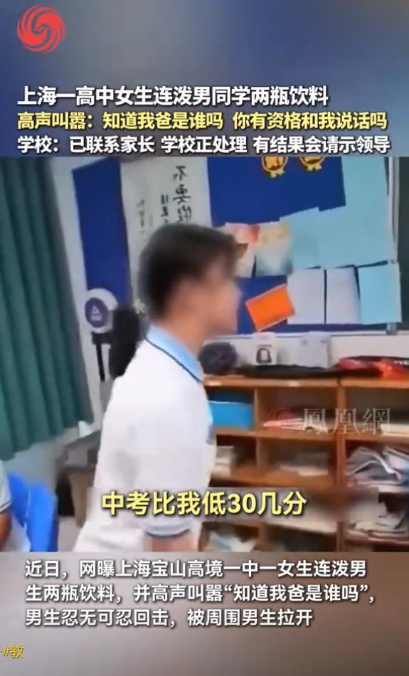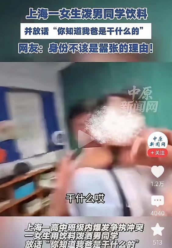 近日,一段发生在上海某高中的视频在网络上迅速传播,引发了广泛关注。视频中,一名女高中生在教室里将手中的饮料泼向一名男同学,并伴随着辱骂和威胁,最后更是抛出一句“你知道我爸是干什么的”来施压,态度极其嚣张。