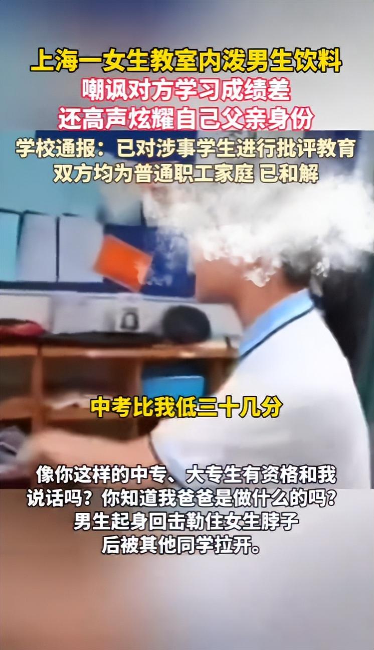 杭州网《#上海 一女生教室内泼男生饮料,嘲讽对方#学习成绩 差,还高声炫耀自己父亲身份,学校通报:已对涉事学生进行批评教育,已和解,双方均为普通职工家庭。(都市快报)》