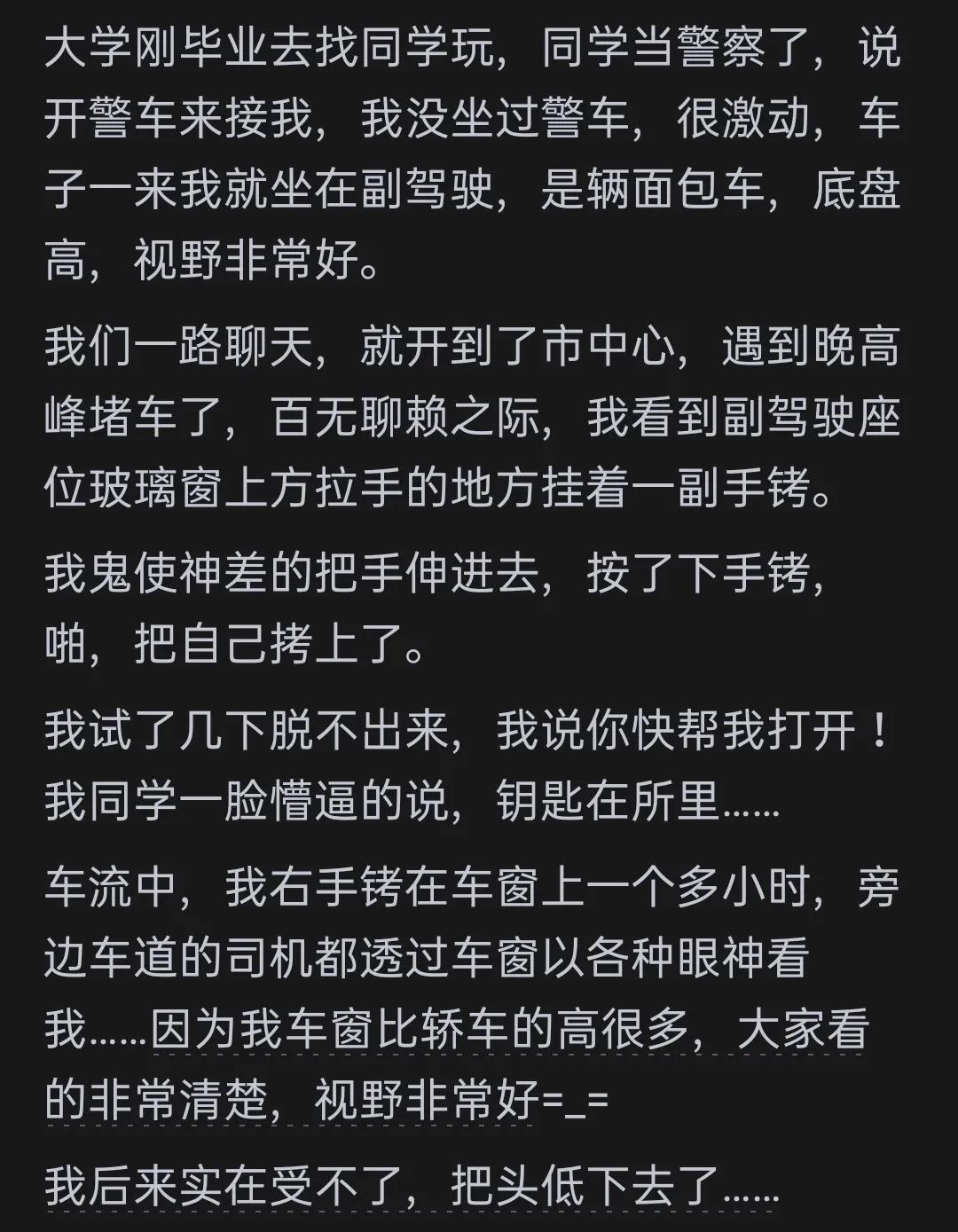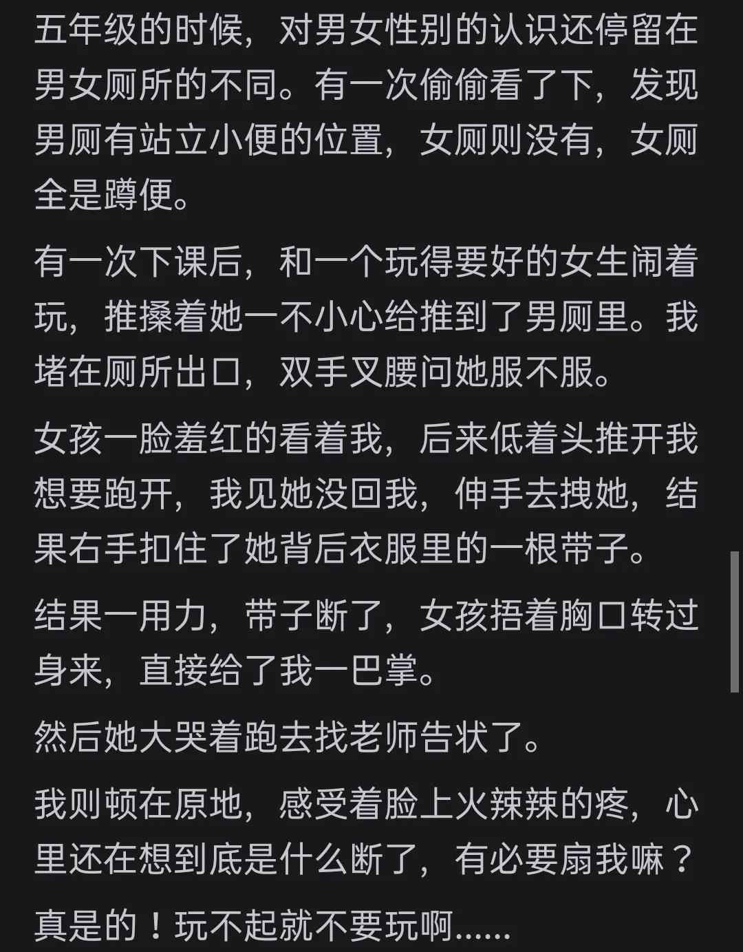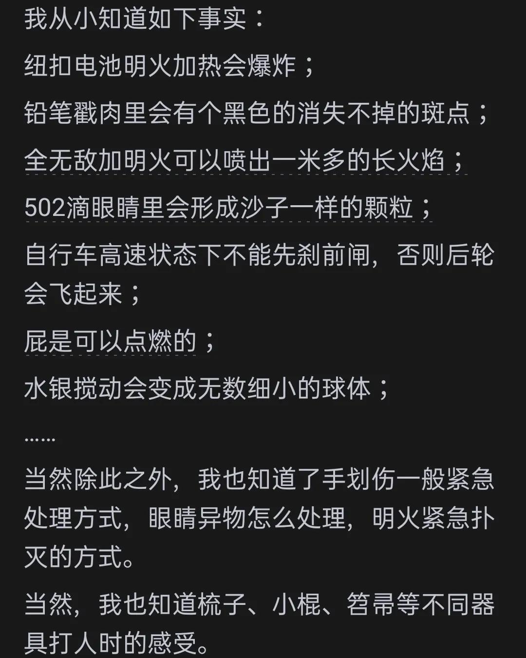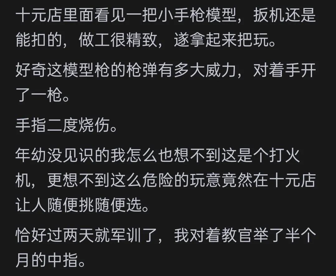 更有网友分享了一系列“手贱”导致的惊险经历:“我妈让我去扔玻璃瓶,我手贱,非要远抛,狠狠一扔,撞到了石头上,玻璃片反弹回来一片,直接砸到我眼镜上。心脏突突的跳,差点就瞎了,幸亏戴了眼镜。回家告诉我妈,被我妈痛骂了半天。还有一次,想试试飞翔的感觉,加速助跑一脚登上秋千,结果秋千惯性,把我甩地上了,爬起来失声了,不会说话,去找我妈,啊啊啊的叫说不出来话,被我妈嫌烦骂走了。我呆坐在秋千上觉得我真是个可怜的哑巴。过了一会儿,会说话了,哈哈。”这位网友的经历可谓是惊险连连,让人不禁为他捏了一把汗。