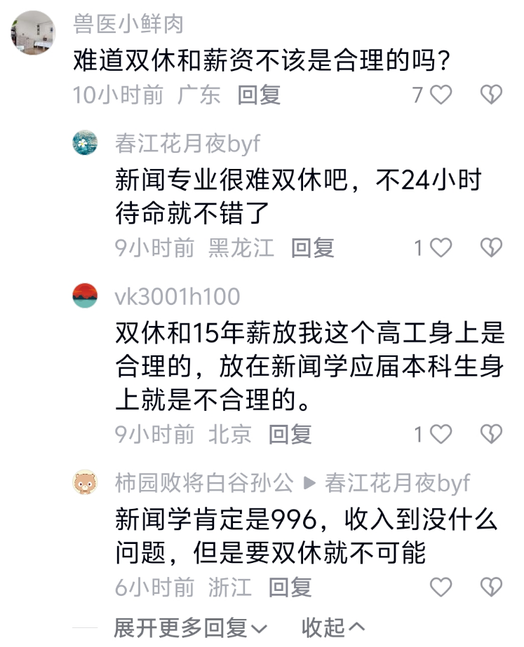 这位女硕士的专业是新闻专业,而该专业的工作性质决定了难以实现双休,基本上都是996的工作常态。毕竟,新闻不会等你双休,能否抓住新闻的时效性才是关键。对于新闻专业的同学来说,双休几乎是一种奢望。