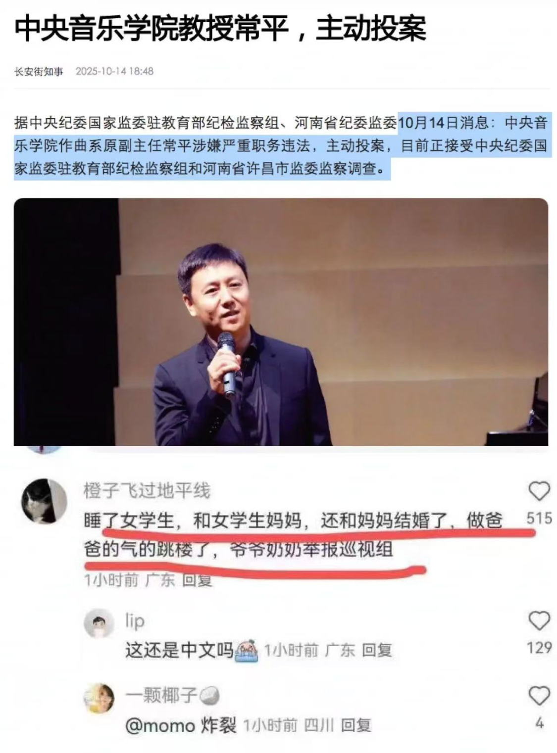 据中央纪委国家监委驻教育部纪检监察组与河南省纪委监委于10月14日联合发布的消息,中央音乐学院作曲系原副主任常平因涉嫌严重职务违法,已主动向相关部门投案自首。目前,常平正接受中央纪委国家监委驻教育部纪检监察组与河南省许昌市监委的联合监察调查。