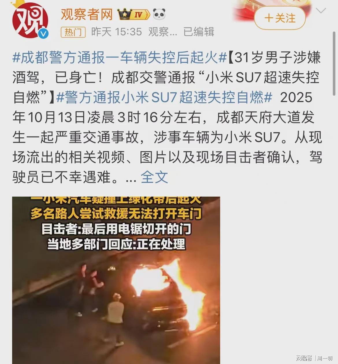 直播弹幕中“雷总好久不见”“小米加油”的整齐刷屏,与三天前成都小米汽车起火事故形成刺眼对比。这已是小米汽车今年至少第二起引发广泛关注的事故——3月高速智驾撞隔离带致三死、8月公安部警示“高阶智驾”陷阱、工信部严查车企虚假宣传,行业监管风暴下,小米的应对显得尤为被动。