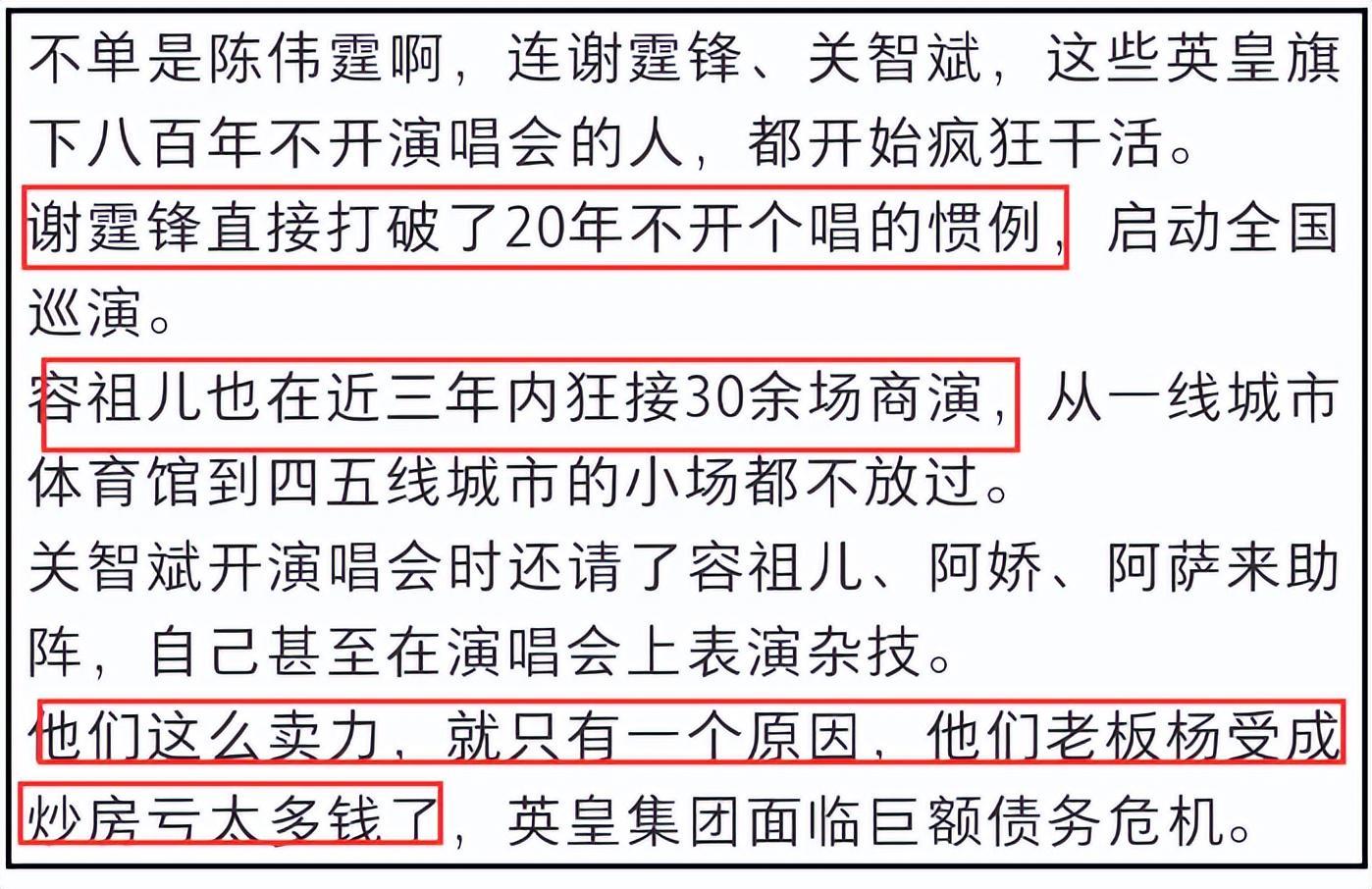 此外,还有网友爆料,陈伟霆“一把年纪”还频频来内地演偶像剧,就是为了拼命打工还债。不仅是他,谢霆锋卖命开巡回演唱,容祖儿、阿娇、关智斌等人也疯狂工作,全都是为了解决英皇的债务危机。