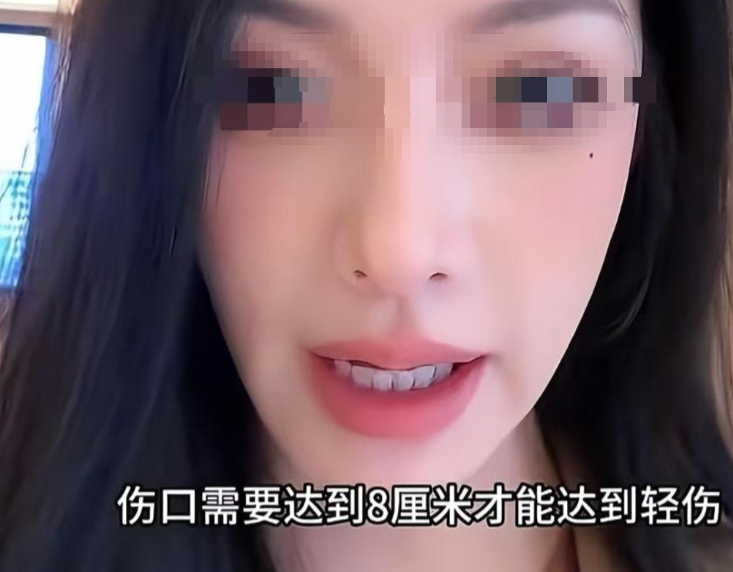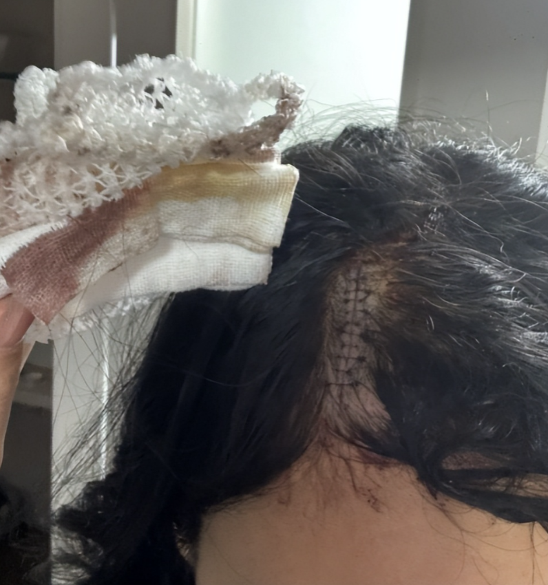 经医生诊断,她额头的伤口长达 5 厘米,距离轻伤标准的 8 厘米只差3 厘米,一共缝了11 针。