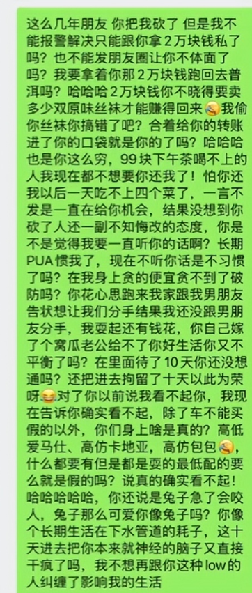 看到涵涵和男友感情没受影响,她又在朋友圈阴阳怪气地发 “有的人就是贱,被砍了还贴着男人不放”,