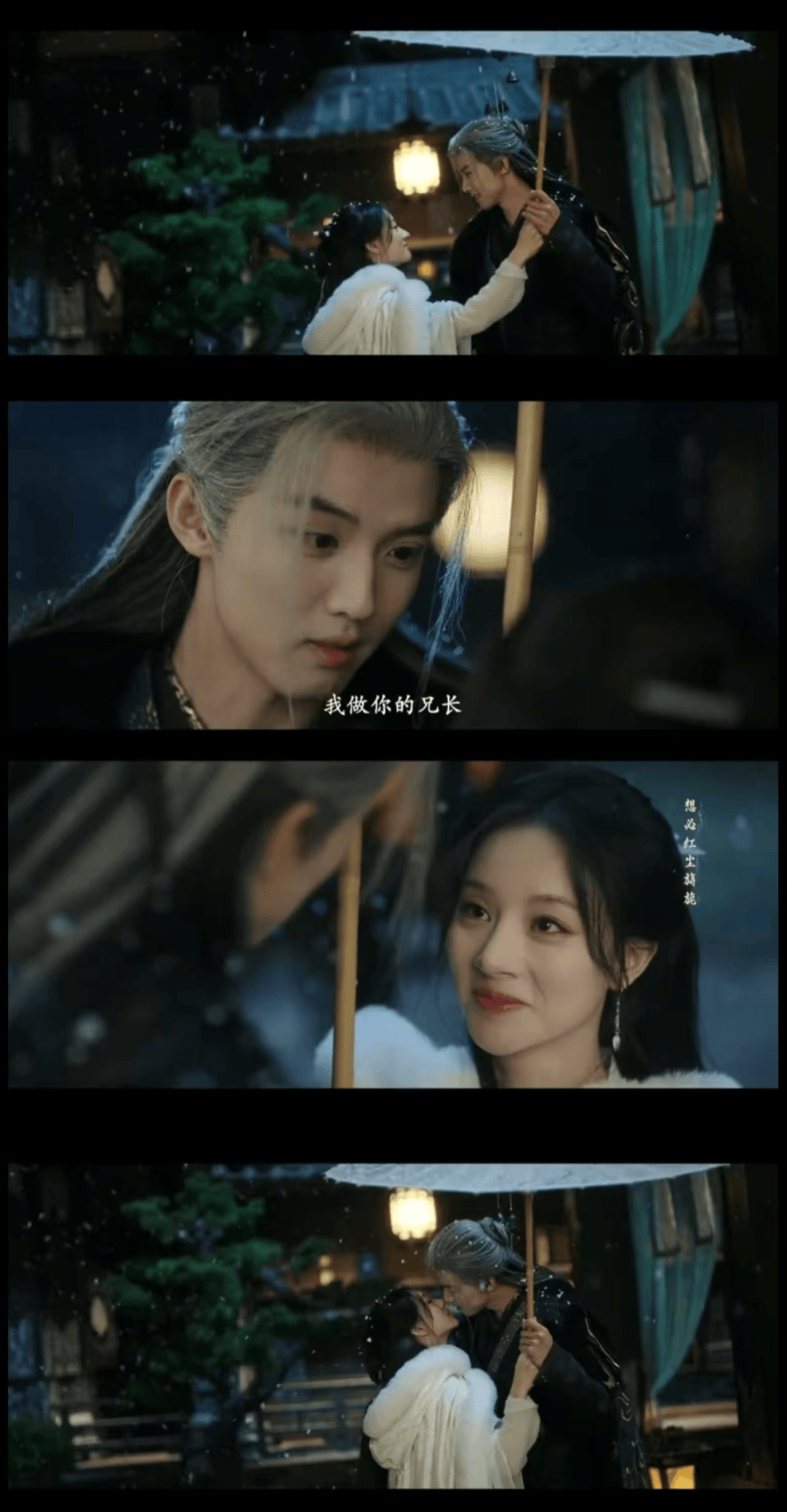 如果说剧情是‘基操’,那么《金昭玉醉》的视听语言便是‘推手’。结尾那场‘雪花吻’堪称封神名场面:漫天飞雪中,男女主共撑一伞深情拥吻,冷色调雪景与人物暖光形成强烈对比,伞柄滑落、发丝沾雪的慢镜头,将破碎灵魂的共生宿命感推向高潮。适时响起的浪漫BGM,让观众直呼‘哭到隐形眼镜移位’。