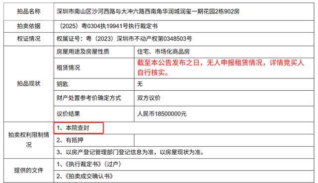 以华润城润玺一期即将法拍的2栋902房为例,拍卖公告就明确提示:拍卖物权利限制情况包括“本院查封”和“有抵押”;同时还提示“水、电、煤气、有线电视等户名变更手续,由买受人自行办理,相关费用自理”。但这套房产之所以那么顺利成交,其中主要原因是低于市场价格优势,此外原主人对外宣称“十分干净”,产权清晰、没有长期租约等,并表示可以在11月底至12原初腾挪交房,为竞拍人扫除交付疑虑。