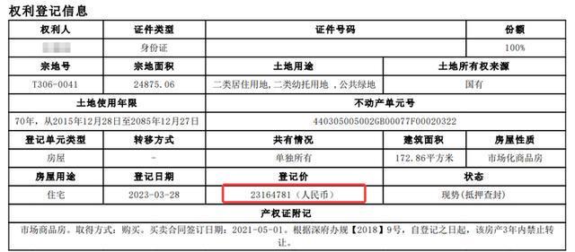 10月16日,华润城润玺一期一套约172㎡的房产被摆上法拍平台,起拍价定为1850万元,单价仅约10.7万元/㎡。经过激烈竞拍,该房产最终以2309万元落锤,折合单价13.4万/㎡,溢价近25%。然而,这套房产当年的登记价约为2316万,账面几乎打了个平手,昔日的暴利已不复存在。