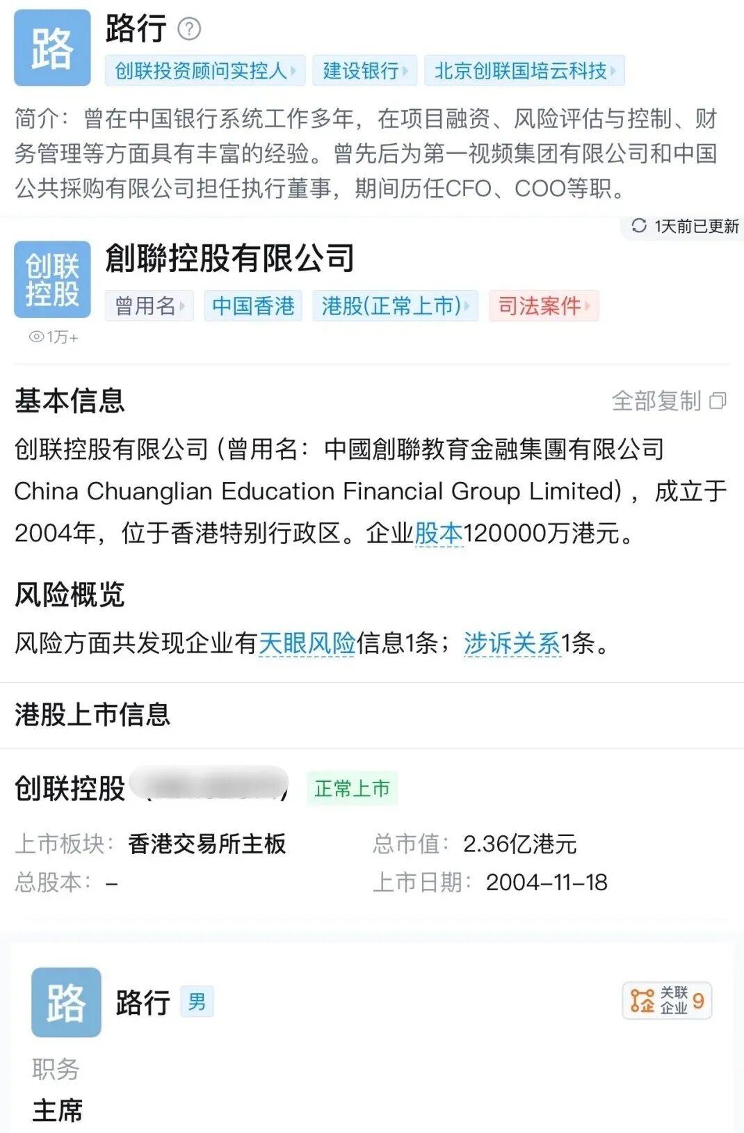 2014年底,路行委任力创联控股有限公司执行董事及董事会主席,该公司光注册资本就高达5000万元人民币(实缴1100万元人民币)。