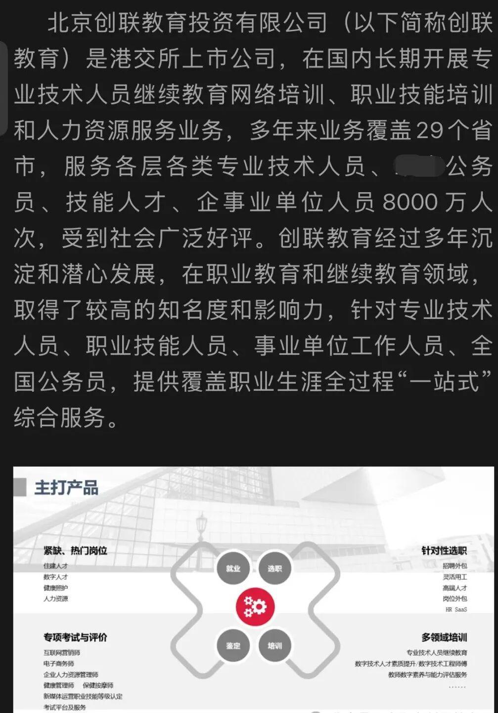 其次,北京创联教育投资有限公司的主营业务是在线教育服务,涵盖公务员培训、职业资格认证及专业技术继续教育等领域,这类型的业务不仅吃官方资源,还很费心力。