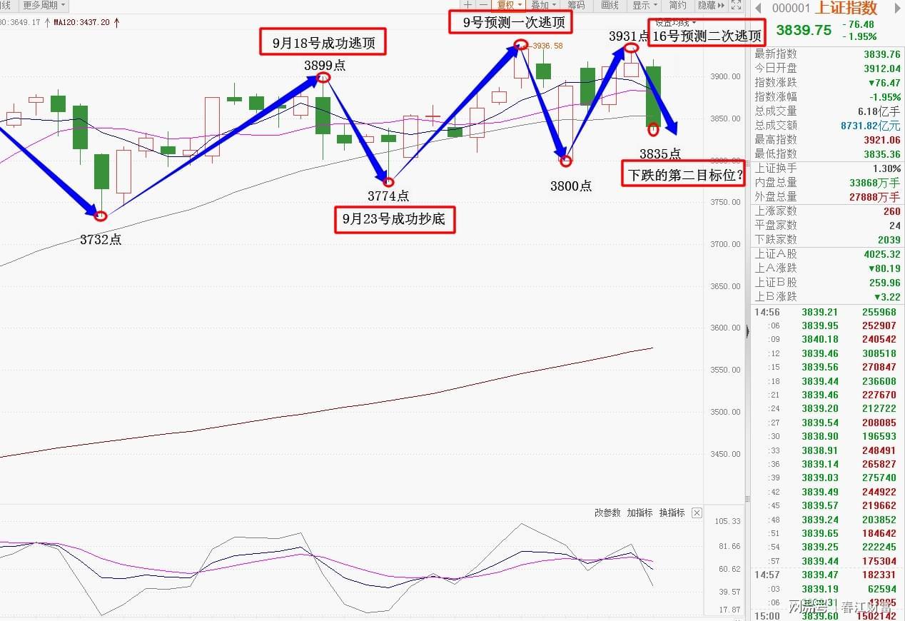 结果验证:大盘在3931点精准波段筑顶,与9号预测的3936点一次筑顶形成“M头”形态。周五沪指加速跳水至3835点,短短两日暴跌近百点。后市如何演绎?