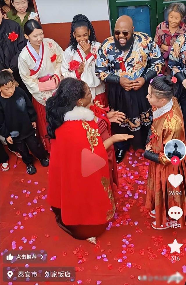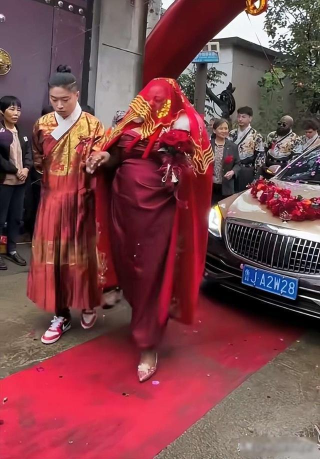 新娘身材高大,需人搀扶行走。她放弃了西式婚纱,选择中式红袍,头饰也仿照古装剧样式。新郎全程贴身照顾,扶着她胳膊、递水、帮她站稳,眼神始终追随着她。尽管新娘中文并不流利,但她坚持举办中式婚礼,既是为了尊重丈夫的家庭,也是出于自己的心愿。
