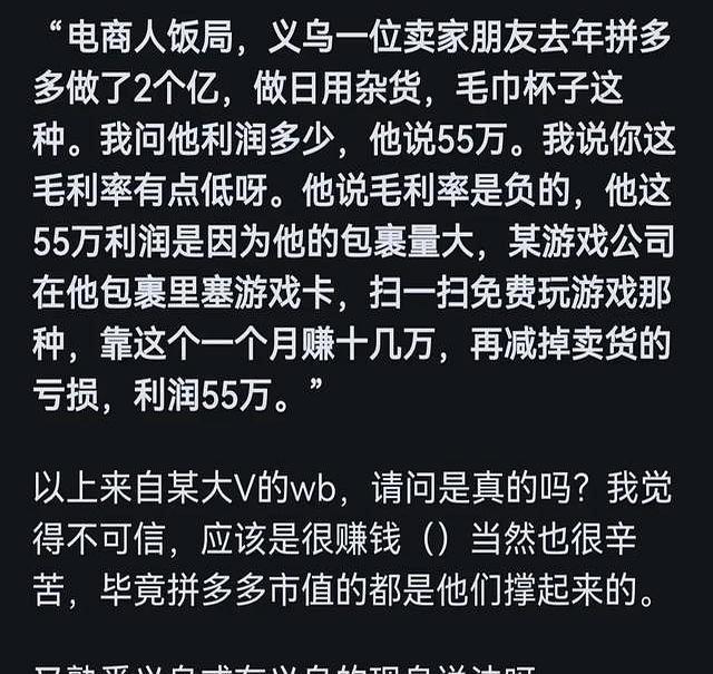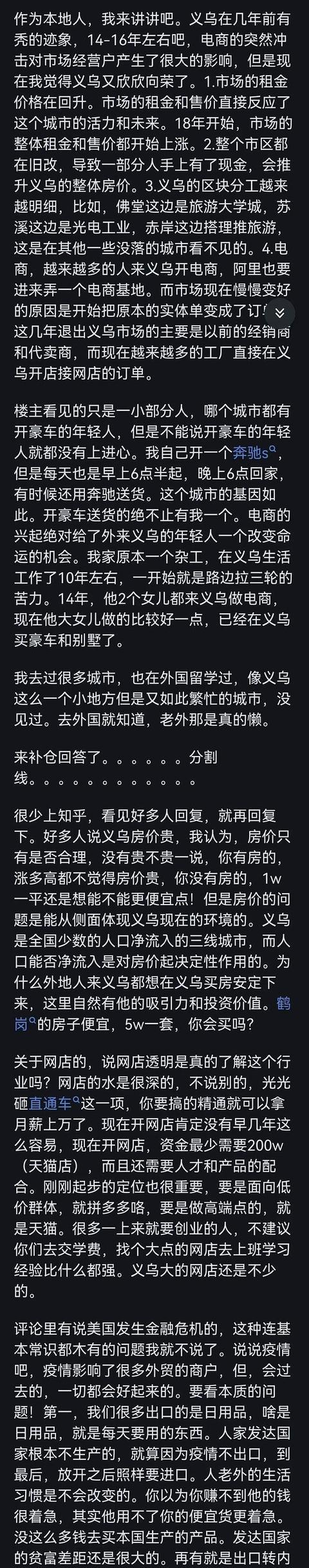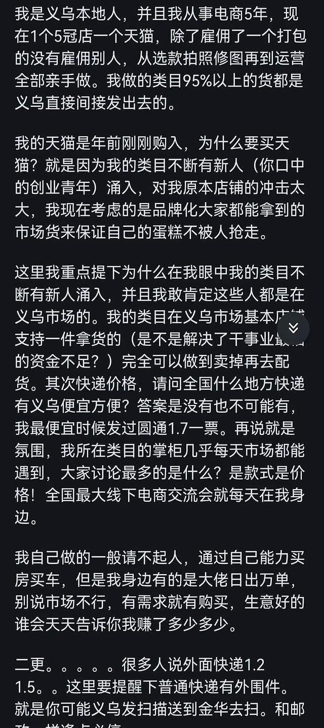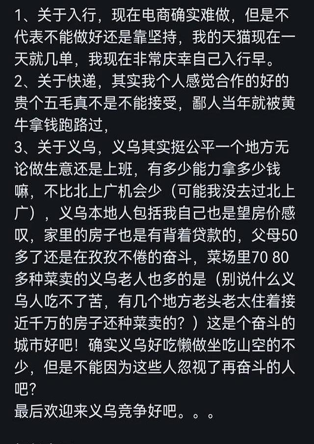 另一个网友则揭示了电商对义乌市场的冲击:“摊主表面上说没开网店,背地里全在网上搞。进货价和零售价越来越看不懂,工厂自己开店,谁还去市场排队买。”确实,随着电商的兴起,越来越多的摊主和工厂开始在网上销售商品,直接跳过了传统的市场渠道。