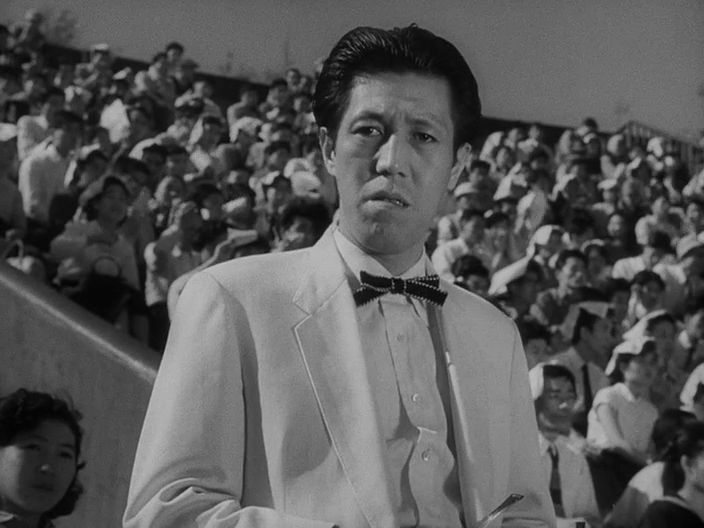 接近栗田的方法,是透过球气一平(伊藤雄之助 饰),他是为这位种子选手支付大学学费、操办比赛的赞助人,(在栗田悠闲地摆动他的球棒时,球气一平告诉他「太早得分了」,虽然在我看来,更紧迫的问题是栗田僵硬的前腿,阻碍了他转移重心),栗田把自己的职业事务都委托给他,让他赚得盆满钵满。