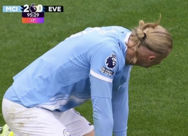 具体来看,比赛补时阶段的第92分钟,哈兰德在中圈附近接到直塞球,面对两名防守球员和门将的封堵,他停球调整时间过长,最终打门被门将扑出。仅仅两分钟后,哈兰德再次获得单刀机会,这次他成功晃过了门将,但传球却出了底线,再次错失良机。到了第96分钟,哈兰德第三次获得单刀机会,但推射再次被埃弗顿门将皮克福德扑出,这一次他也彻底失去了信心,直接跪倒在草皮上。