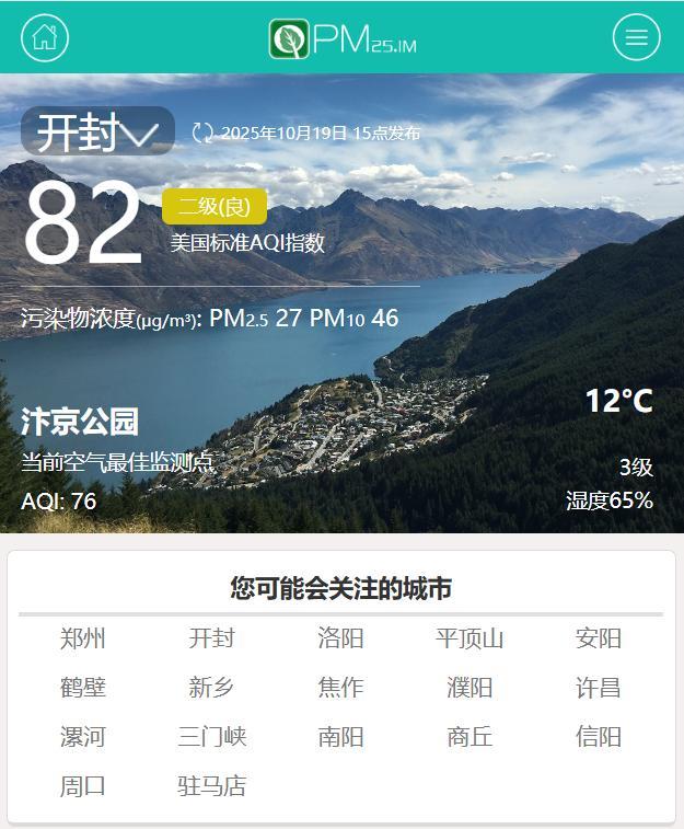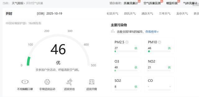 公开数据显示,10月份以来,除了10月16日开封空气质量是良之外,半个多月均为优。10月19日下午3点发布的开封6个监测站点PM2.5数值,均未超过30μg/m³,均为良。
