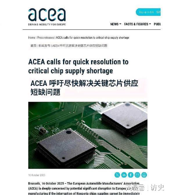 承担安世半导体70%出货量的东莞封装厂,因中国商务部出口禁令无法向海外客户交付芯片。10月16日,欧洲汽车制造商协会代表大众、宝马、特斯拉等16家主流车企发布紧急声明,称已收到安世芯片断供通知,并警告欧洲汽车生产线可能因此停摆。从制裁出台到产业警报拉响,全程不足三周。