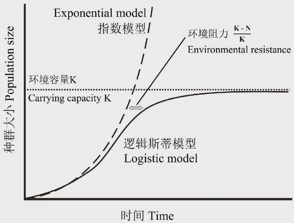 如没有限制,人口以指数增长,如下图红线所示;
