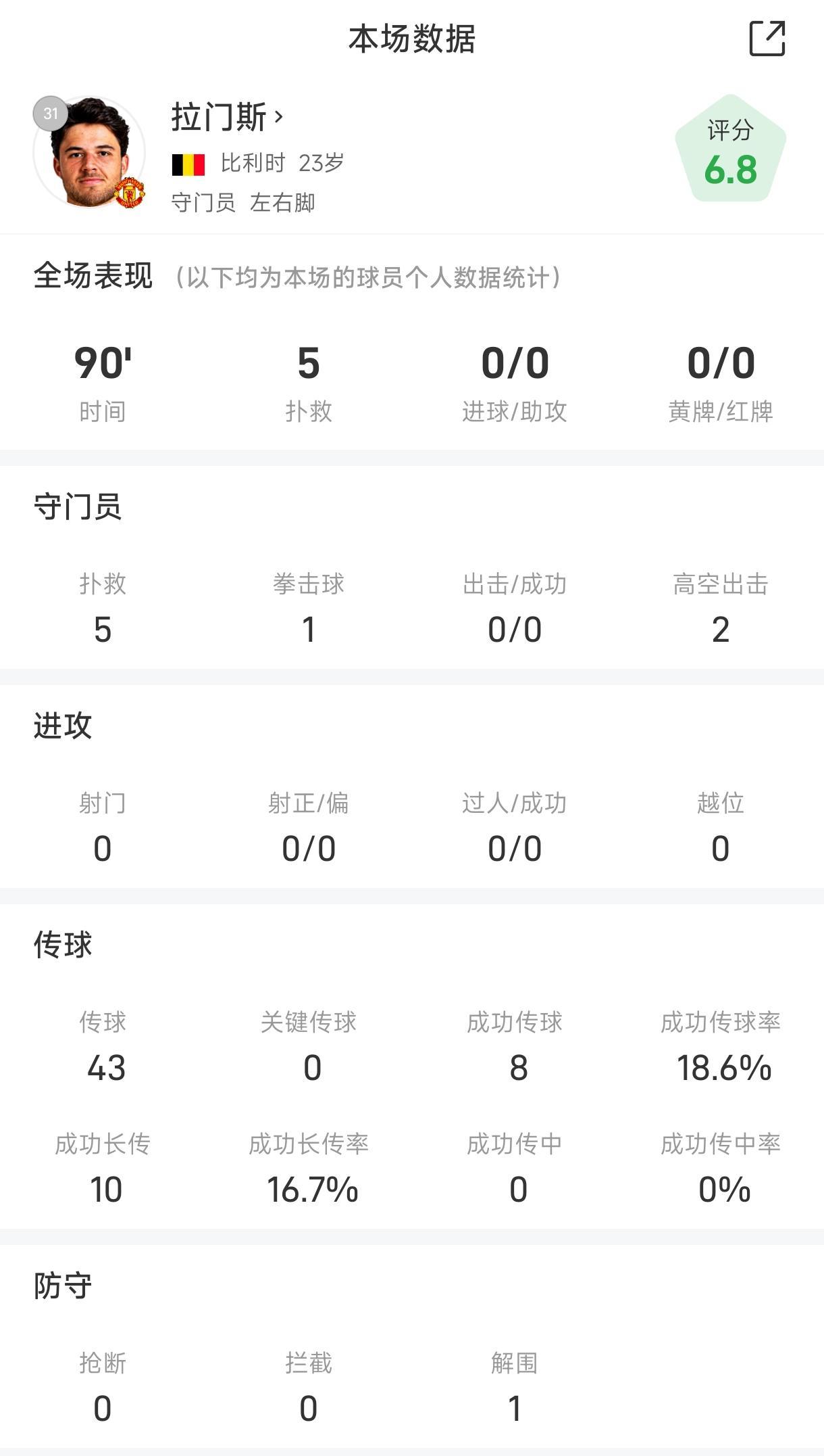 本场比赛,拉门斯展现出了顶级门将的综合素质:面对利物浦潮水般的进攻,他不仅完成了5次关键扑救,更通过2次高空出击和1次拳击球化解了多次险情。数据统计显示,其全场触球次数达32次,成功传球21次,长传成功率高达78%,在攻防两端均发挥了重要作用。
