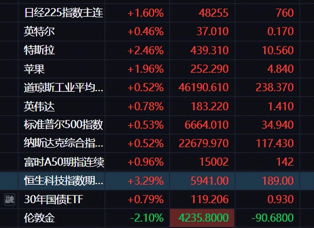 周五晚间,美股三大指数集体收涨,其中道指上涨0.52%,纳指同样上涨0.52%,标普500指数则上涨0.53%。热门科技股方面,涨跌不一,特斯拉涨幅超过2%,苹果涨幅接近2%,而甲骨文跌幅超过6%,超微电脑、ARM跌幅均超过3%,博通跌幅超过1%。汽车制造与消费电子板块表现强劲,库克音乐涨幅超过14%,Stellantis涨幅超过3%,索尼、华纳音乐、通用汽车、福特汽车、丰田汽车涨幅均超过1%。相比之下,贵金属与采矿、有色金属板块则表现不佳,黄金资源跌幅超过16%,科尔黛伦矿业、泛美白银跌幅均超过8%,金田跌幅超过7%。