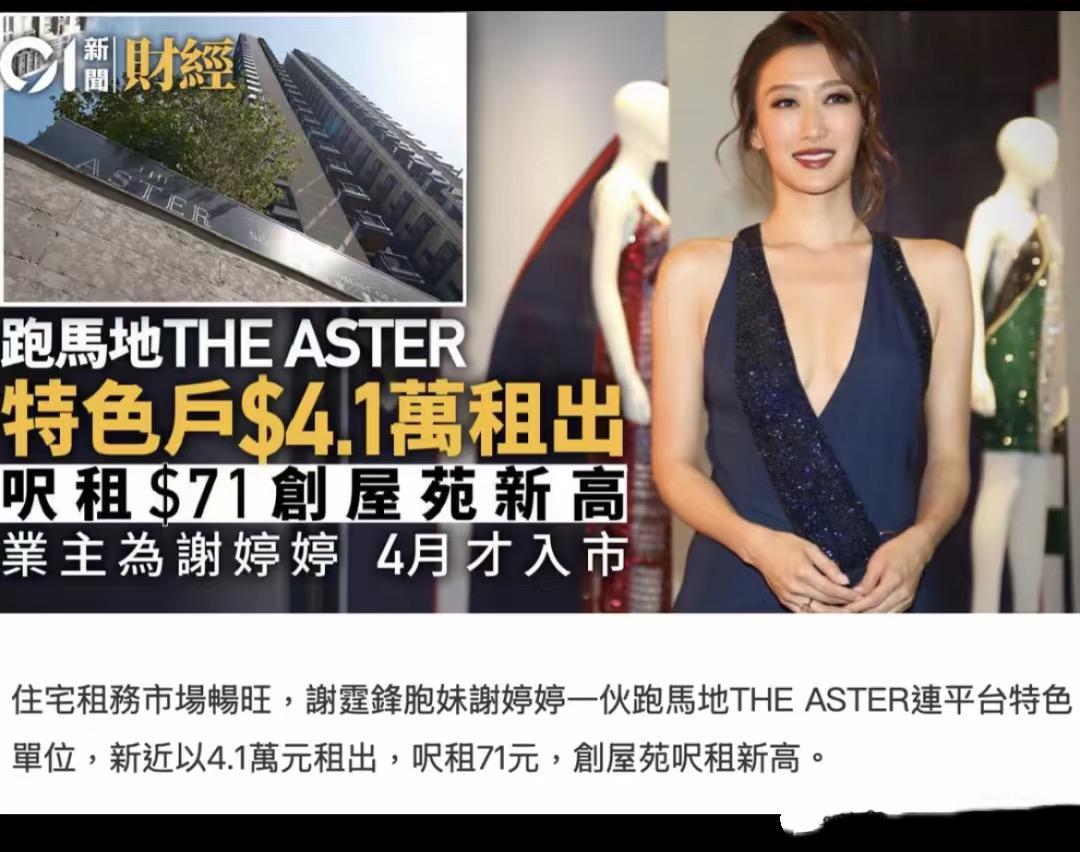 光是在香港,谢婷婷就有两处房产。其中一处是2017年10月谢霆锋斥资3000万港元购入的位于西环维壹的单位,作为生日礼物及嫁妆送给谢婷婷。另一套是2025年4月,谢婷婷以1710万港元在香港跑马地新楼盘THE ASTER买下的一套低层两房特色户,此次购房是她个人出资,用于投资收租。