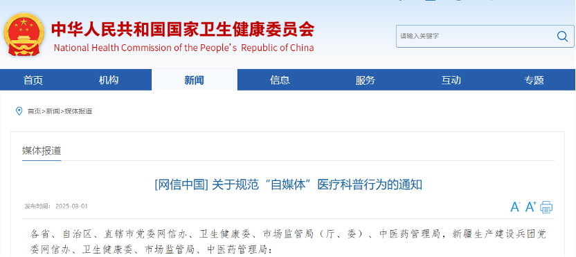 8月1日,中央网信办、国家卫健委、市场监管总局和国家中医药管理局四部门联合发布《关于规范“自媒体”医疗科普行为的通知》(下称《通知》)。