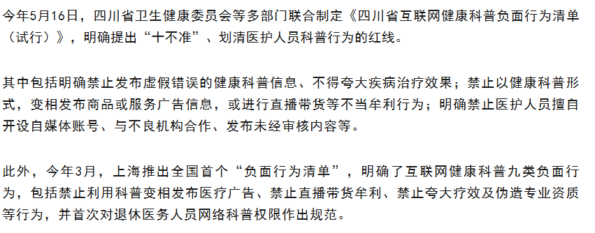 在政策与法规层面,很多地方已出台规范性文件予以规制,如上海市、四川省等地区出台的《互联网健康科普负面行为清单(试行)》,通过划定禁止性规定,为健康科普内容立规矩、树标准。