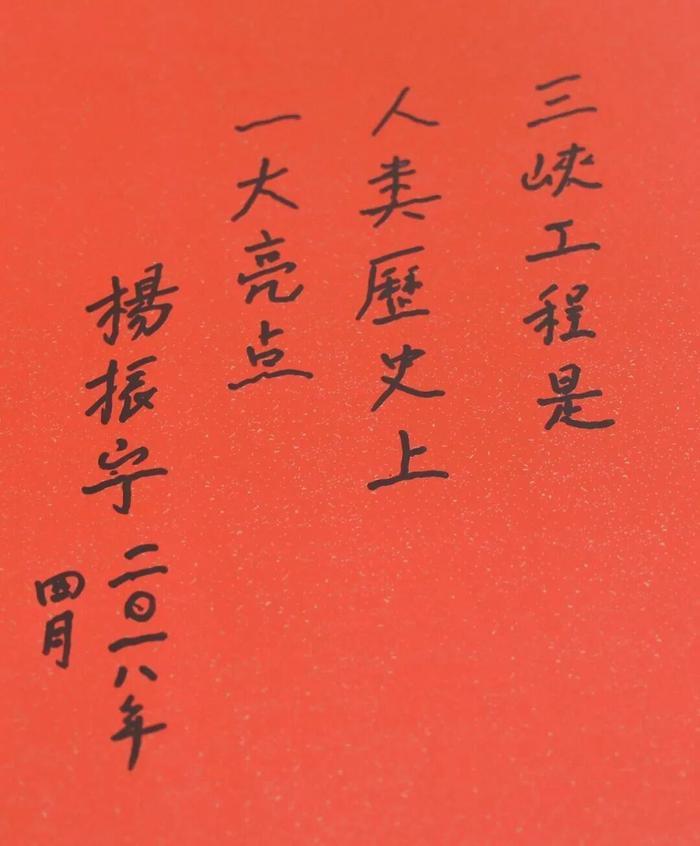 面对滔滔江水,宏伟的大坝,杨振宁心潮澎湃。在三峡工程展览馆,他挥笔题词:三峡工程是人类历史上一大亮点。令杨光诺欣慰的是,父亲的字迹依然端庄工稳,排列有序。他觉得父亲能有这样的状态,翁帆女士是最大的功臣,父亲是第二段婚姻的受益者。
