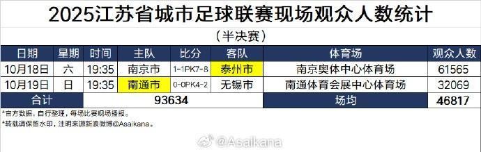 10月4日,大屏幕显示本场比赛共有61355名球迷到场观赛。 “苏超”四分之一决赛中,南京队主场与连云港队在常规时间1比1战平,通过点球大战,南京队以5比3的总比分战胜连云港队,晋级半决赛。 新华社发