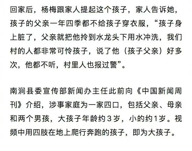 据南涧县委宣传部新闻办主任透露,野人小孩实际上是一对兄弟中的哥哥,他还有一个一岁的弟弟。视频中频繁出现的都是哥哥的身影。有村民多次目睹野人小孩在大冬天被父亲拉去水龙头下冲洗身体,这种行为让很多人看不下去,纷纷劝说却无济于事,甚至报警也未能改变现状。孩子的母亲对别人的议论非常敏感,每次被提及都会用眼神瞪视对方,导致很多人不敢再劝说。