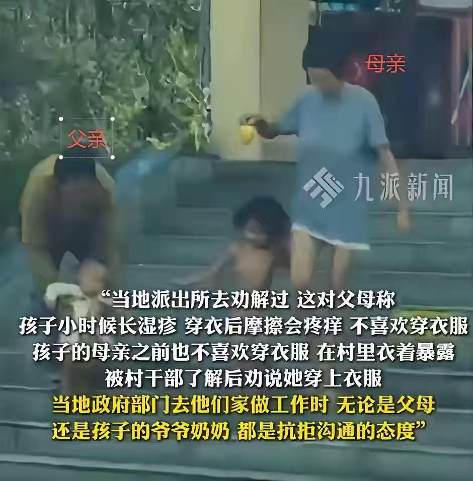 在另外一个视频中,野人小孩的一岁弟弟也曝光了出来。与哥哥不同的是,弟弟是穿着衣服的。当被问及为什么不给哥哥穿衣服时,他们的妈妈回应称是因为哥哥从小就患有湿疹,是他自己不爱穿衣服,所以就习惯了。虽然有人认为小孩三岁时不穿衣服不当回事,但至少应该给他穿条内裤。