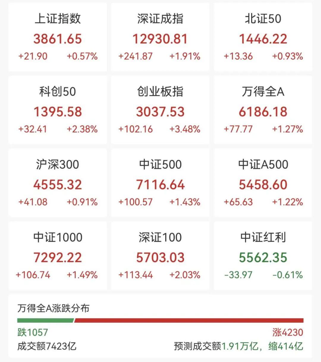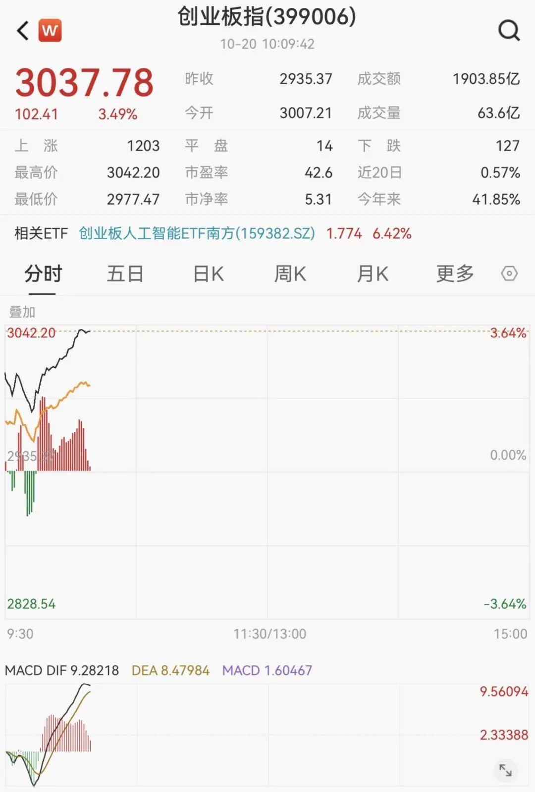 10月20日开盘后,A股市场呈现普涨格局。截至收盘,创业板指涨幅达3.2%,深成指上涨1.9%,上证指数小幅攀升。港股市场同步走强,恒生科技指数大涨3.5%,网易、蔚来、阿里巴巴等科技股涨幅均超4%。