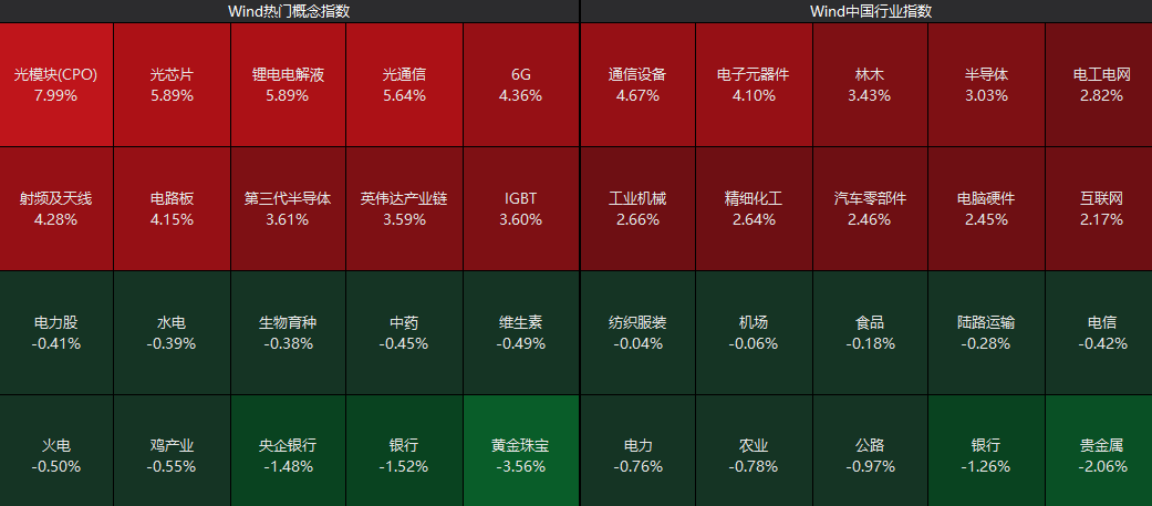 从行业表现看,算力硬件板块成为当日最大赢家。CPO概念股平均涨幅达6.8%,电子元器件、半导体板块紧随其后。贵金属、银行、农业等防御性板块出现小幅调整。个股方面,全市场超4200只个股飘红,赚钱效应显著。