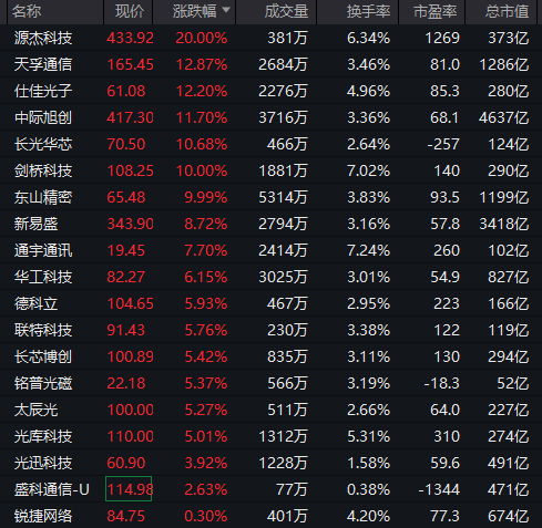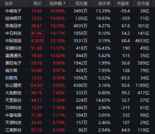 通信设备与电子元器件板块同步走强,中威电子、经纬辉开以20%涨幅封板,珠海冠宇、中石科技、荣旗科技等跟涨。行业分析师指出,随着AI算力需求持续释放,高速连接器、光芯片等细分领域将迎来长期发展机遇。