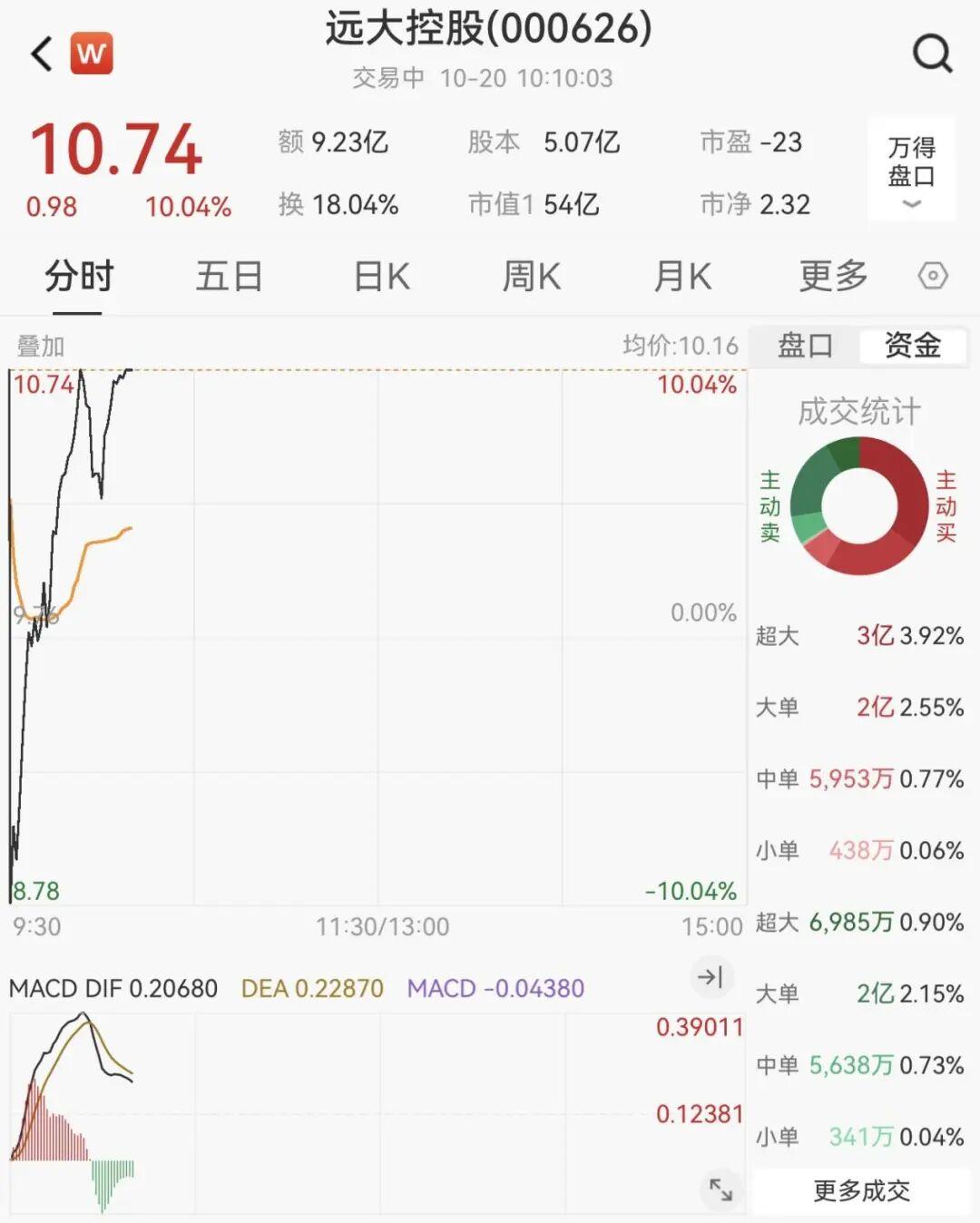 当日最受关注的个股当属远大控股(000626)。该股早盘以涨停价开盘后直线跌停,随后在15分钟内快速拉升至涨停板,完成“天地天板”极端走势,最终实现五连板,收盘价定格在10.74元/股。盘后数据显示,主力资金全天净流入达2.3亿元。