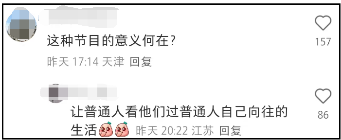 还有网友开始质疑,这种节目存在的意义到底是什么?完全就是浪费观众的时间。毕竟前几季还会让嘉宾劈柴、做饭、给鸭子搭棚,让明星走进普通人生活,让观众看到他们真实的一面,从而治愈生活。