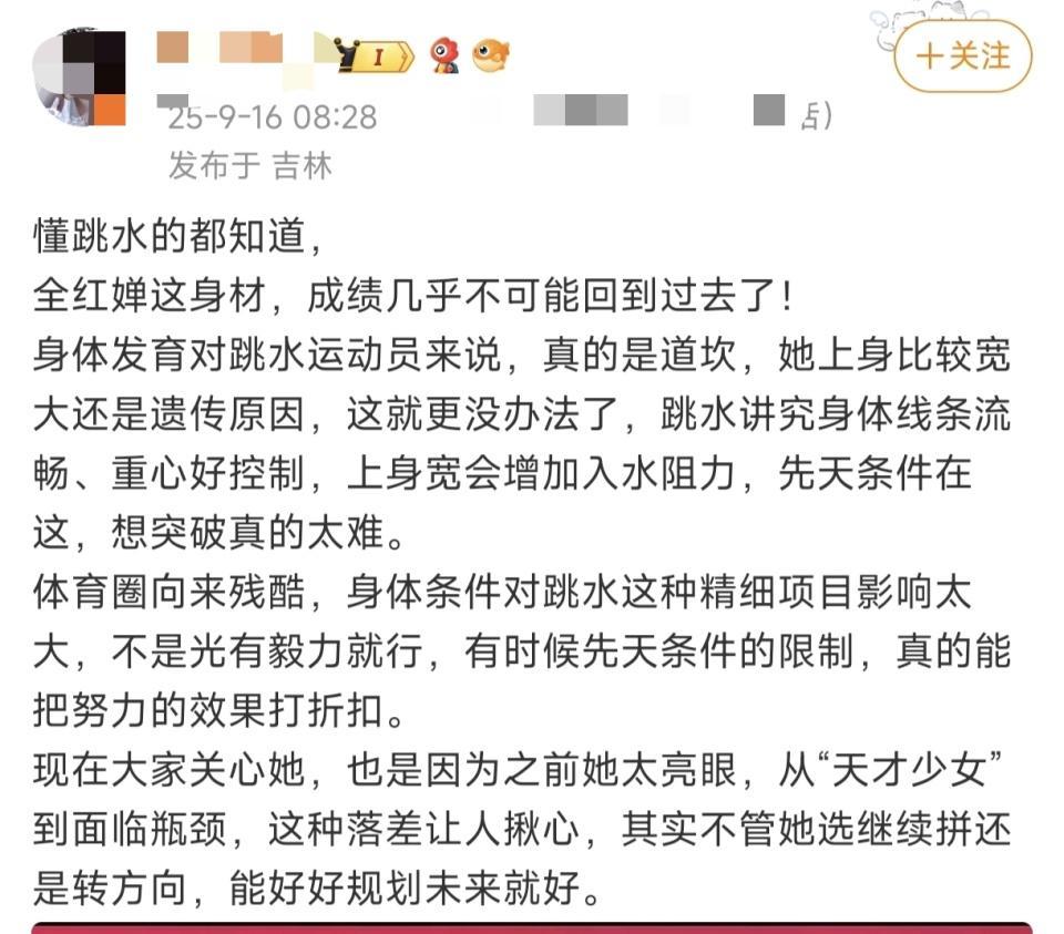 '体育向来残酷,身体条件对跳水这种精细项目影响太大,不是光有毅力就行。有时候先天条件的限制,真的能把努力的效果打折扣。现在大家关心她,也是因为之前她太亮眼,从天才少女到面临瓶颈,这种落差让人揪心。其实不管她选择继续拼还是转方向,能好好规划未来就好。'