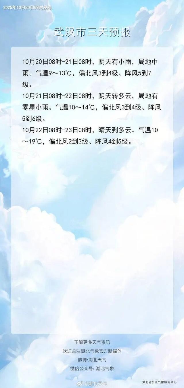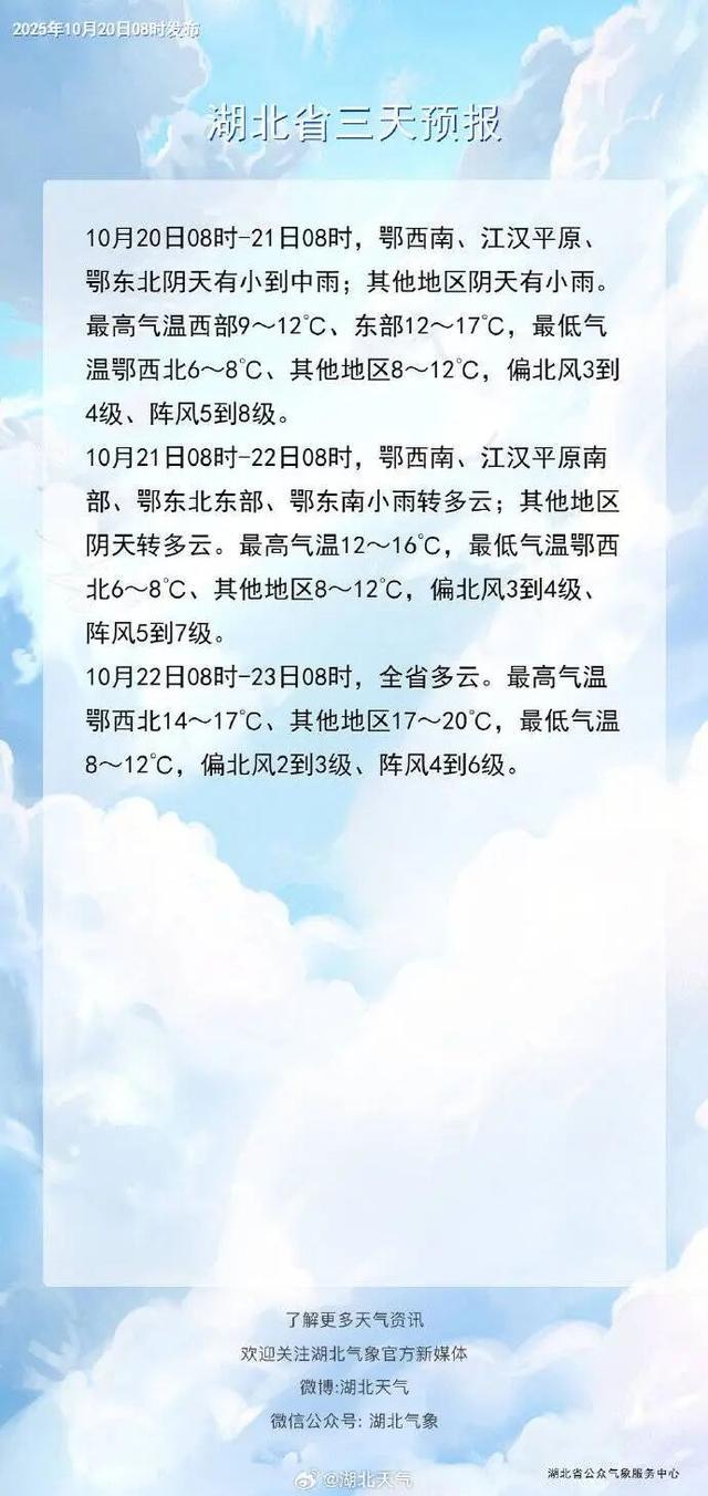 据湖北省气象局20日消息,预计今天我省阴雨持续并伴有大风降温天气,大部地区有小雨,鄂西南、江汉平原、鄂东北西部有中雨,西部最高气温降至9~12℃,东部降至12~17℃。明天(21日)我省持续阴雨天气将逐步结束,大部地区转为多云,仅南部有小雨飘洒。至26日我省将以晴到多云为主,气温缓慢回升,最高气温逐步升至19~23℃。此外,未来三天早晚凉意明显,昼夜温差加大,鄂西北最低气温仅6~8℃,其他地区8~12℃,市民们需注意及时添衣保暖。
