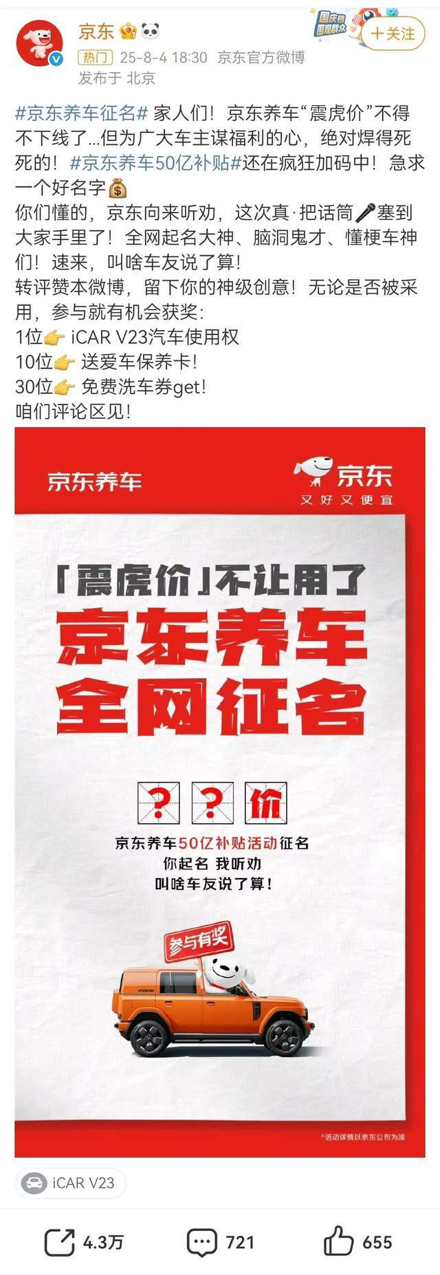 值得注意的是,这个颇具挑衅意味的“震虎价”,让京东与途虎养车之间产生了不小的冲突。2023年,京东养车在微信公众号、微博、抖音等平台推出“震虎价”营销活动,途虎养车随即指控京东养车通过“震虎价”实施商业诋毁及虚假宣传,要求京东养车停止侵权行为,并赔偿经济损失500万元及合理开支14万元。尽管京东养车在此次官司中败诉,但赔钱后还不忘在道歉微博中打广告,推出50亿养车补贴活动,并向广大网友征集新名字。