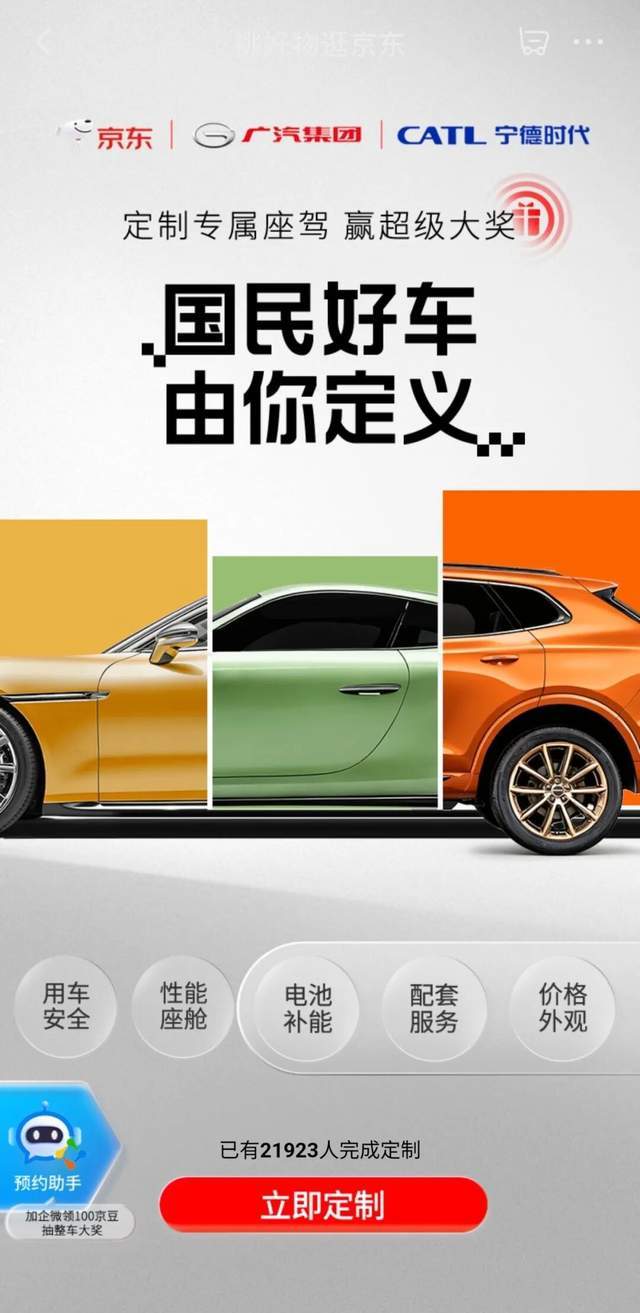 随后,京东又着手切入汽车的生产定制环节。前几天京东在双11发布会上,宣布与广汽、宁德时代要一起合作造车。听到这,网友们纷纷以为京东要做第二个小米。但很快京东下场回应:这款新车是三方联合推出,京东主要提供用户消费洞察和独家销售,不直接涉及制造环节。换言之,继把汽车售后服务搬上电商平台后,京东把汽车定制这件事也搬上了电商平台。消费者在手机上就能看车、预约试驾,还能像挑选商品一样定制汽车配置,打造一款完全属于自己的车。