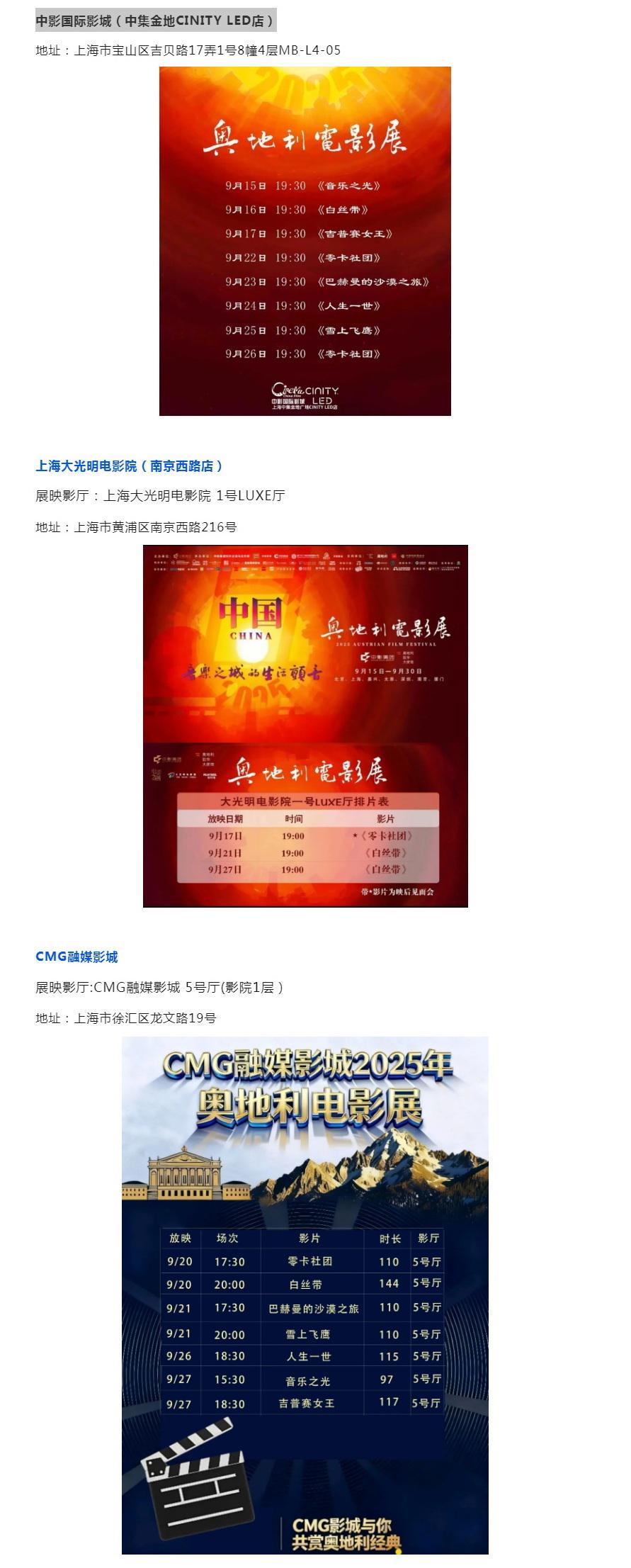 以上作品将在北京、上海、嘉兴、太原、深圳、南京、厦门等七座城市巡回展映。上海站有大光明电影院(南京西路店)、CMG融媒影城和中影国际影城(中集金地CINITY LED店)三家影院参与,场次覆盖本周末和下周末,目前已开票。