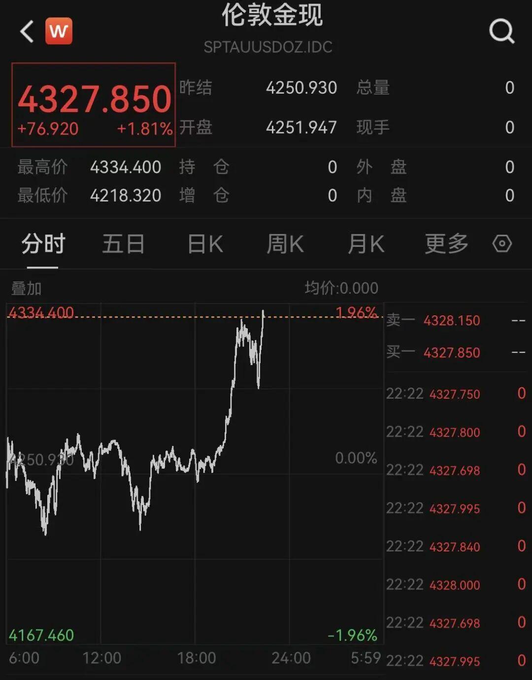 贵金属市场出现戏剧性转折。现货黄金价格在晚间22:30分后突然直线拉升,半小时内冲破4300美元/盎司关口,最高触及4334美元,较日内低点4220美元反弹超2.6%。纽约商品交易所COMEX黄金期货主力合约涨幅更达2.7%,最高报4344美元。技术面显示,金价突破200日均线后,多头资金加速入场,投机性净多头持仓连续三周增加。