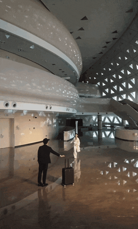《盛夏芬德拉》中男女主角奔赴相拥的场景,取景地在杭州金沙湖大剧院 图源:“钱塘发布”微信公众号