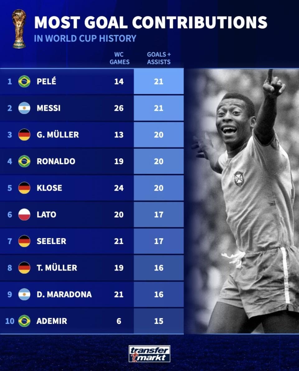 近日,权威数据机构德国转会市场(Transfermarkt)发布了世界杯历史“助攻+进球”综合效率榜单,引发全球球迷热议。在这份涵盖80年世界杯历史的榜单中,巴西传奇贝利与阿根廷巨星梅西以21次并列榜首,但贝利仅用14场比赛(场均1.50)就达成这一成就,而梅西耗时26场(场均0.81)。德国名宿盖德·穆勒以13场20次(场均1.54)的效率紧随其后,巴西“上古神锋”阿德米尔则以6场15次(场均2.50)创下历史最高效率纪录。